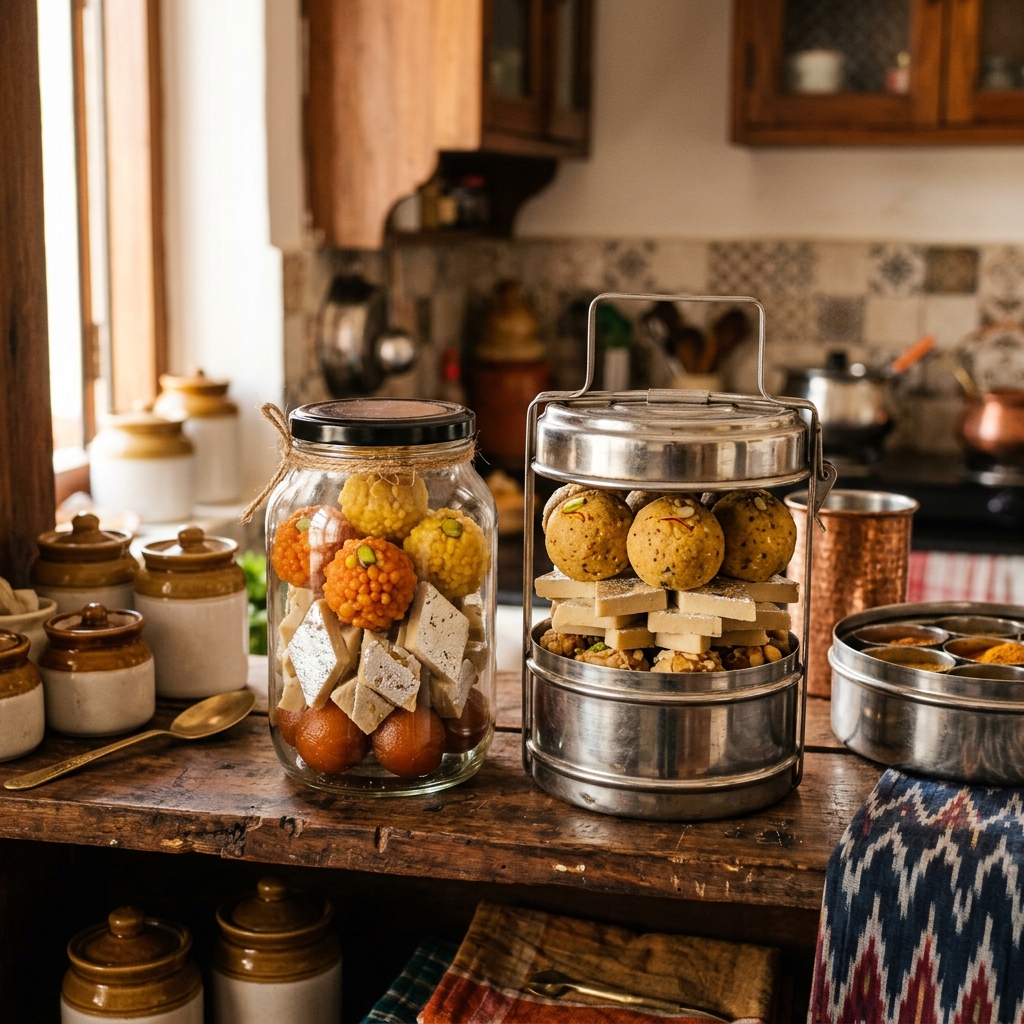 Yes. Humidity accelerates spoilage, especially for preservative-free sweets. During monsoon, use airtight storage and consume within a week, or refrigerate immediately.